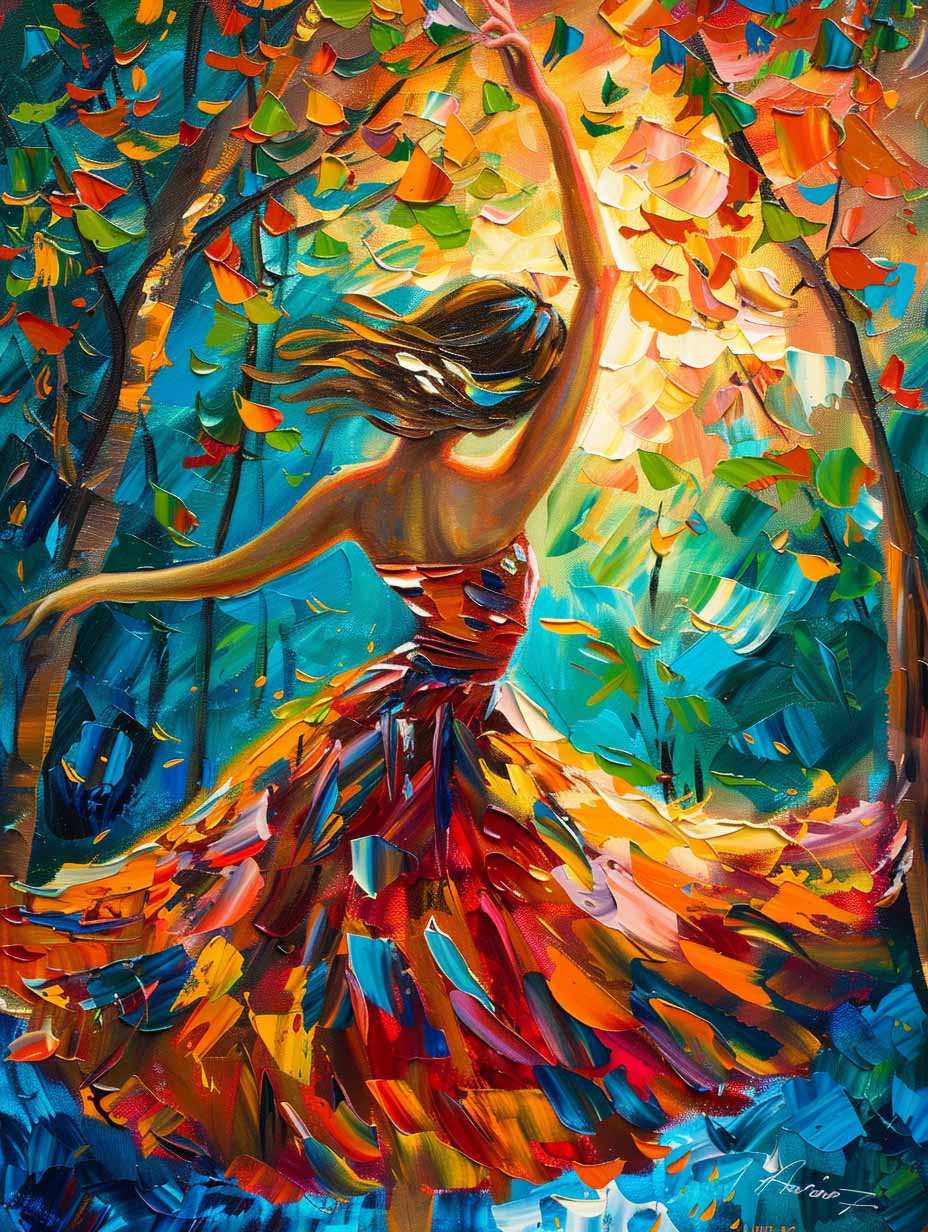 💠 Thousands of shimmering gems bring to life the dancer’s swirling, leaf-patterned gown and the sun-dappled autumn forest, turning every bold stroke of color into a glittering focal point. 💠