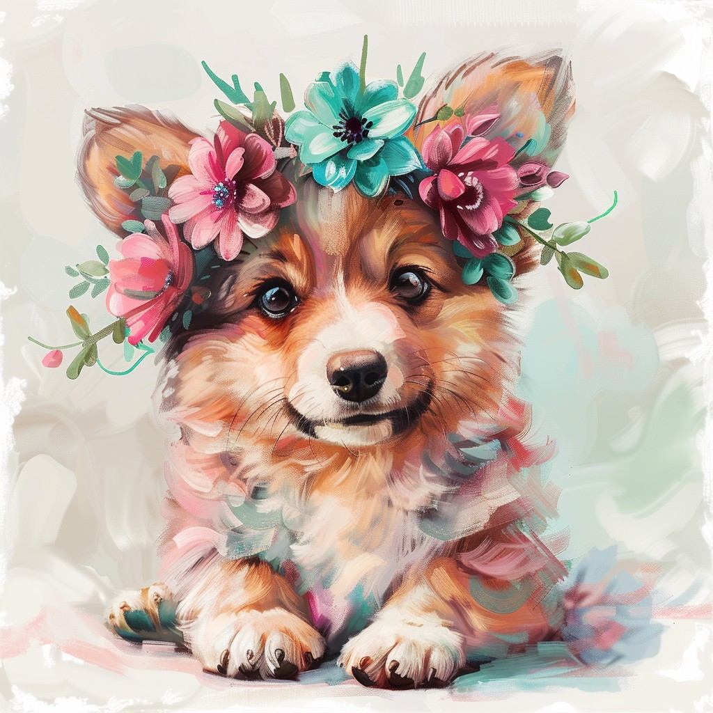 💠This Floral Crown Corgi Puppy diamond painting kit brings the soft, painterly charm of a fluffy corgi to life, one sparkling diamond at a time.💠