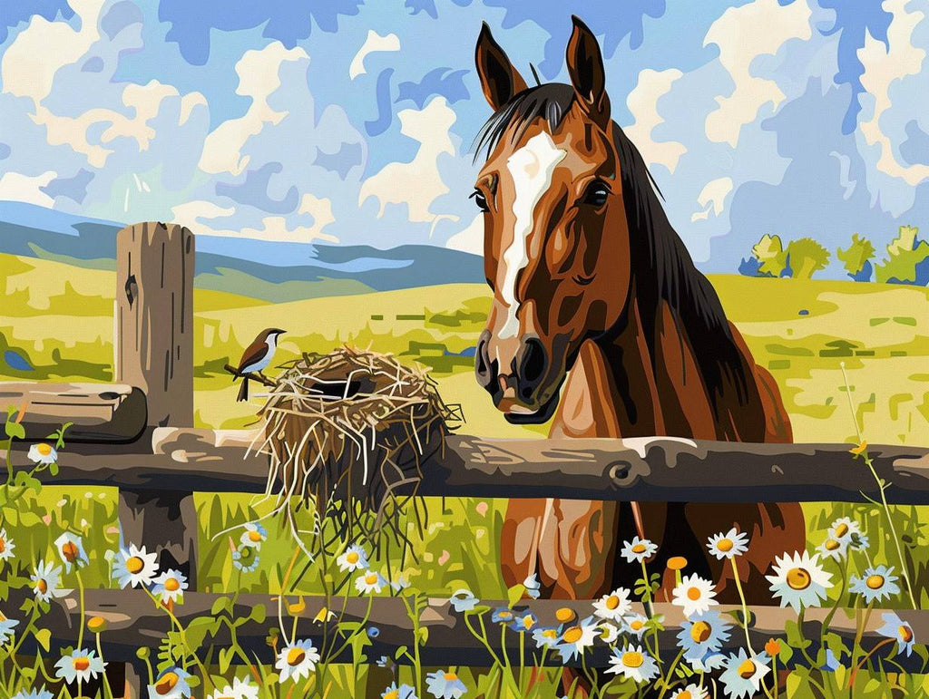 💠Unleash your creativity with our Horses and Birds' Nest Diamond Painting Set! A sparkling diamond brings this enchanting countryside scene to life. See how chestnut horses gaze at the bird's nest, surrounded by blooming daisies and rolling green pastures.💠