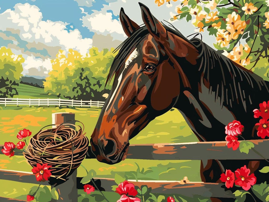 💠 Capture the gentle bond of two glossy chestnut horses, framed by vibrant red blooms and rolling green pastures, as thousands of sparkling gems bring the idyllic scene to life.💠