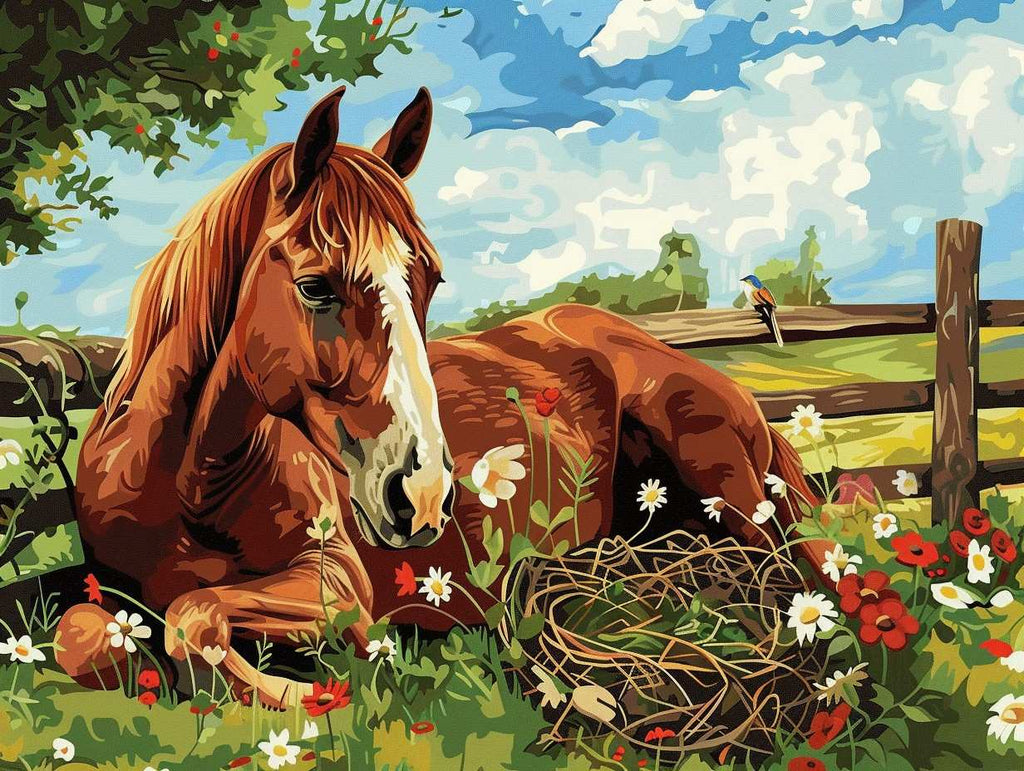 💠This design features a gentle chestnut horse resting in vibrant wildflowers, with a nearby bird perched - all rendered with sparkling multi-faceted diamonds to capture light. 💠