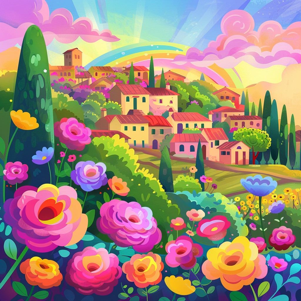 💠This radiant design captures the enchanting charm of a hillside village blessed by the rainbow, with pastel-colored houses hidden among lush greenery and brilliantly blooming flowers. 💠